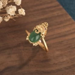 Si vous êtes un adepte de la culture chinoise, vous avez surement déjà entendu parler du Pixiu. Cette créature mythique aux nombreuses légendes est une parfaite source d’inspiration pour un bijou. C’est pourquoi nous avons créé cette bague avec une tête de pixiu, elle aussi ornée d’un sublime jade vert. Une magnifique composition de matériaux et d’esthétique qui fait de ce petit anneau un merveilleux choix de cadeau !