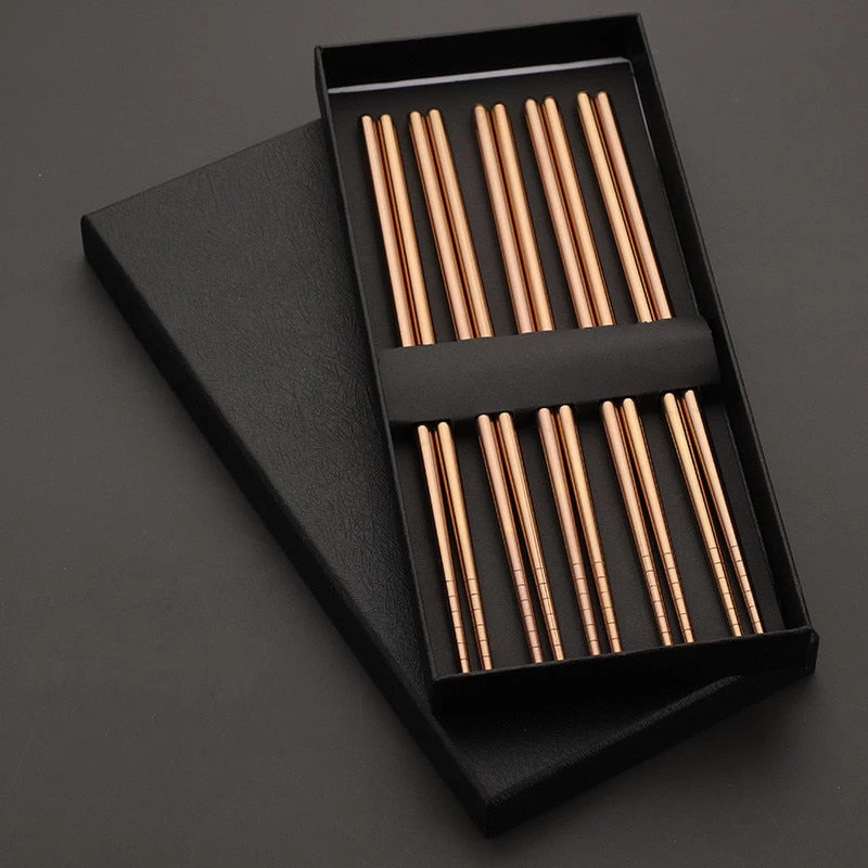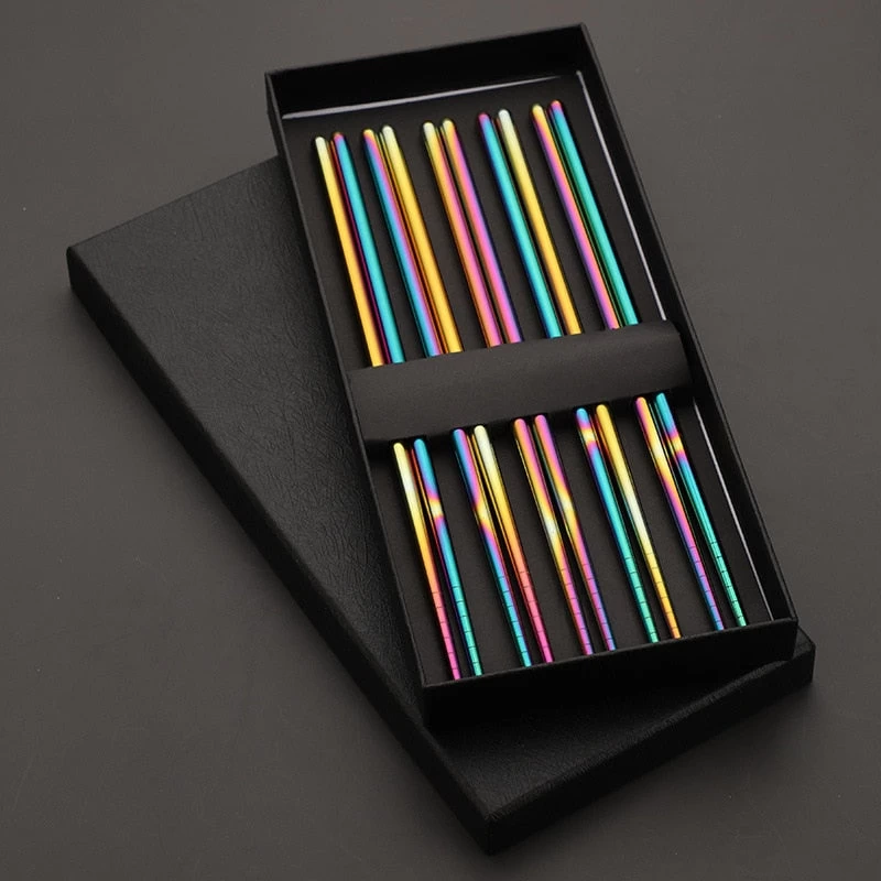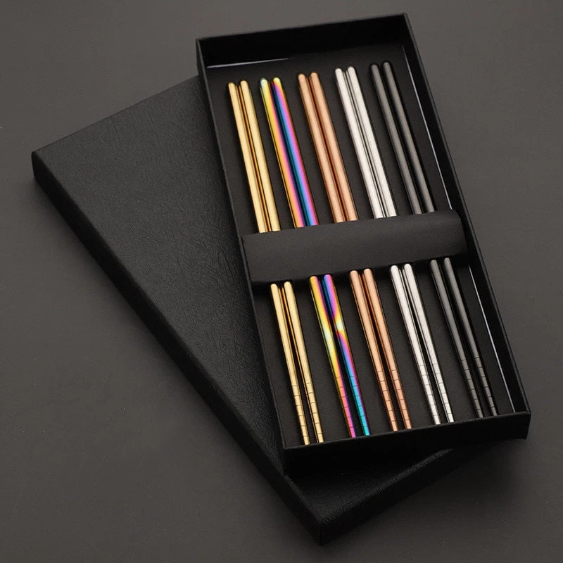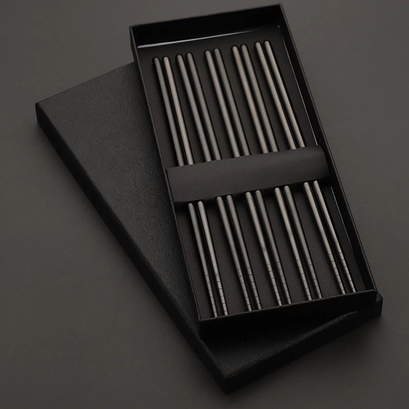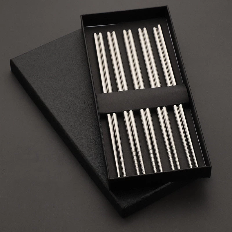 Petit déjeuner, pique-nique, apéritifs, entrée, plat ou dessert, aucun repas ne vous résistera avec ces jolies baguettes chinoises acier. Ce mini service de table est réceptionné dans un écrin noir et contiendra cinq paires. Le manche des couverts est plutôt arrondi alors que le bout présente de petites dents qui faciliteront la prise des aliments, quel qu’il soit : sushi, nouilles, porc au caramel… Tous les couverts asiatiques présents ici sont composés uniquement d’acier inoxydable et respectent les normes alimentaires.