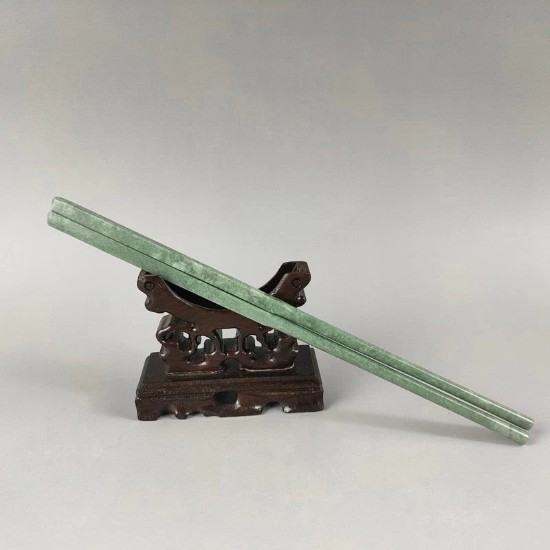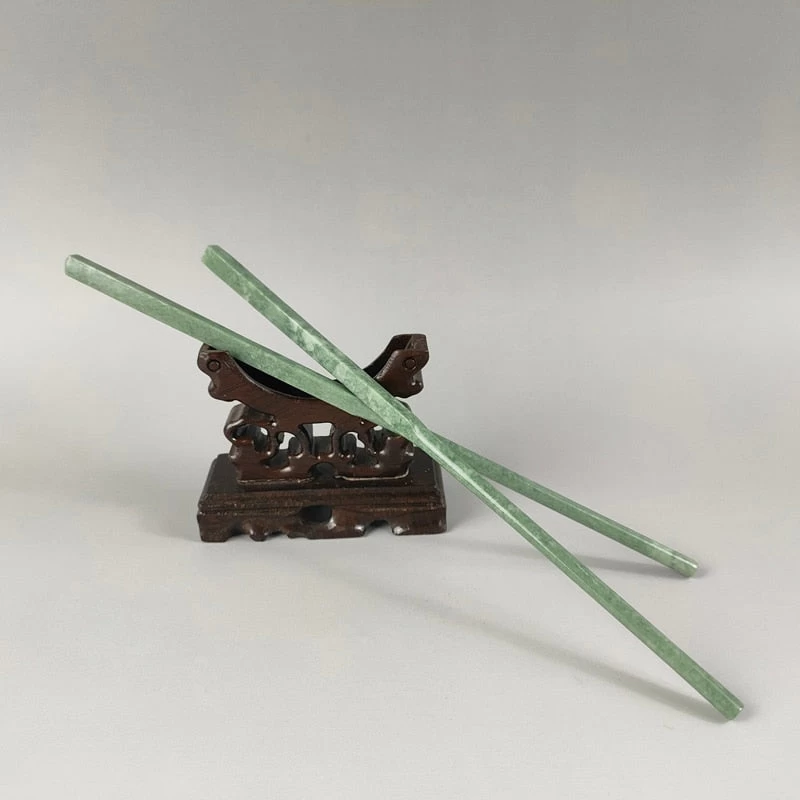 Laissez-vous charmer par cette magnifique paire de baguettes chinoise en jade. Son coloris vert clair, hétérogène, tacheté et dégradé nous apaise puis nous étonne par sa splendeur. Ces couverts asiatiques sont sculptés dans de la pierre naturelle de jade vert. Conçue avec finesse, ils présentent une surface totalement plane, lisse, brillante et sans irrégularités. Le jade est une bonne option pour vos couverts.
