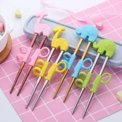 Pour que les marmots mangent comme des grands, on peut sélectionner ce superbe lot de couverts. Ce dernier comporte deux paires de baguettes chinoises attachées entre elles. Elles s’utilisent comme une pince et mettent des anneaux à disposition pour y placer les doigts. Éléphant ou girafe, jaune, vert, rose ou bleu, le choix est libre et en propose pour tous les goûts. Ces deux baguettes liées entre elles seront parfaites pour habituer vos petits à la culture asiatique, à son art culinaire, aux plats piquants, et ce tout en douceur !