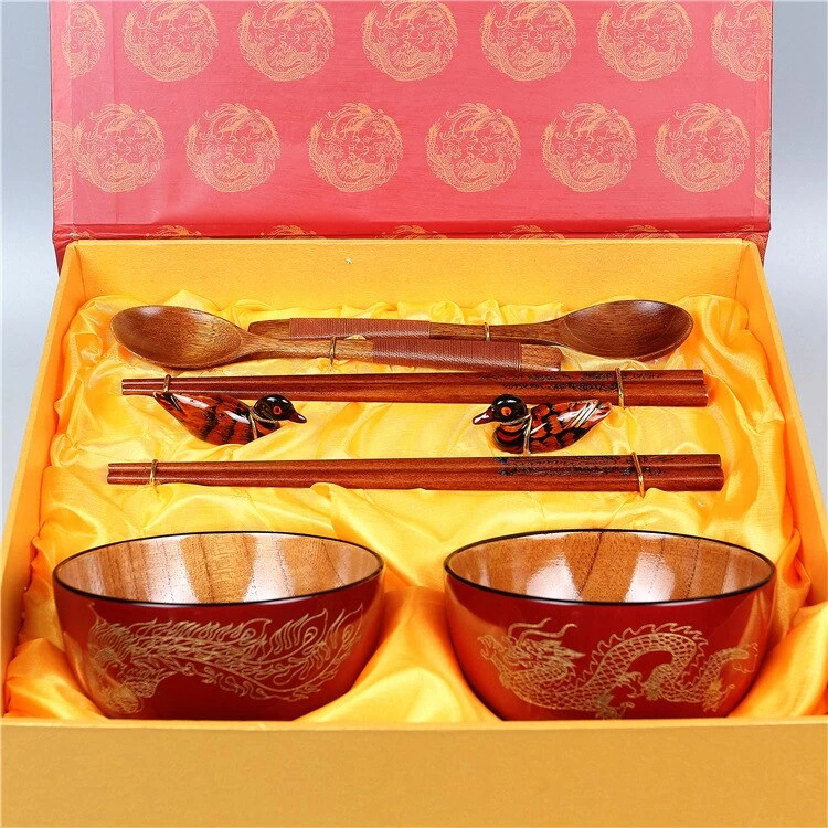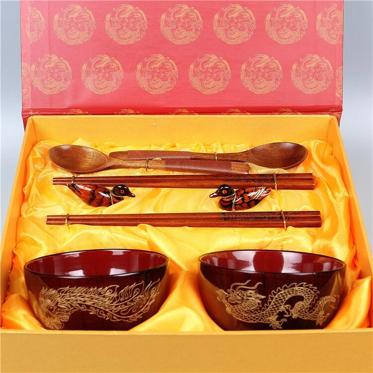 Bol Chinois Dragon en Bois Exotique avec Couverts et Porte-Baguette