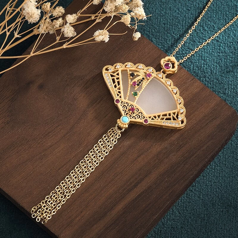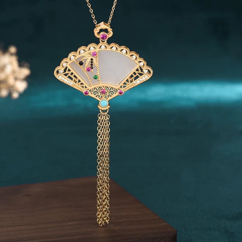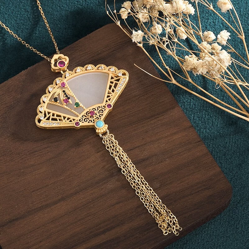 Féminin et élégant, ce sublime collier chinois possède un pendentif éventail très original. Il est très bien détaillé, les bords sont recouverts d’oxyde de zirconium tandis que l’intérieur de l’éventail est comblé par un jade blanc taillé. Pour finir, 5 chainettes s’échappent de la base de l’éventail pour lui donner un côté encore plus audacieux. Ce collier sera idéal pour finaliser une tenue traditionnelle chinoise composée d’un Hanfu ou d’un Qipao.