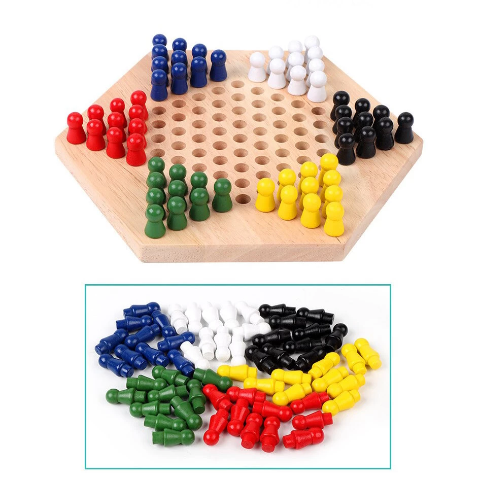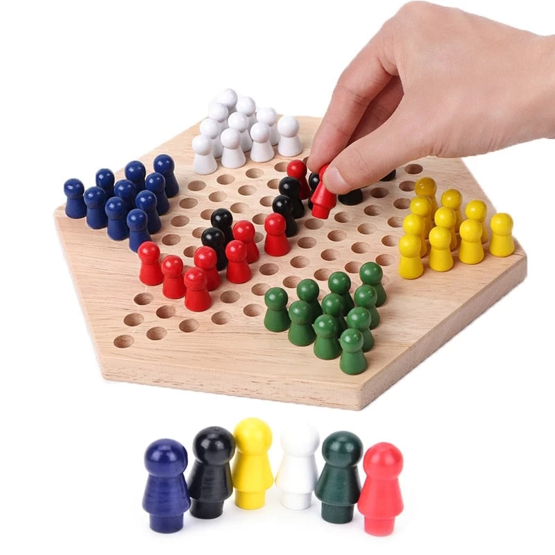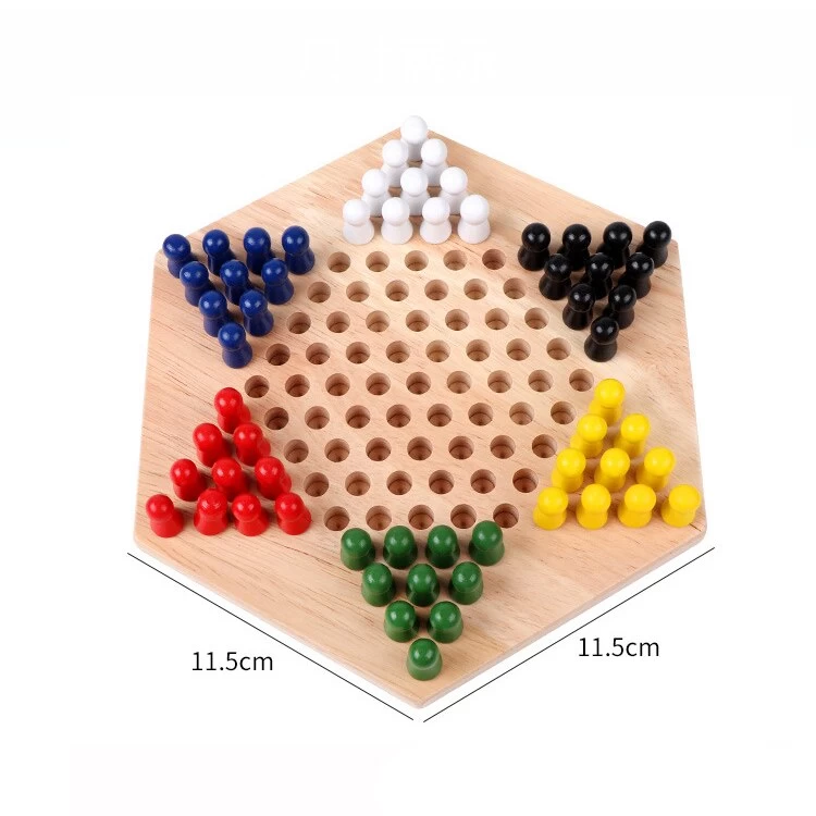 Ici, vous avez accès à un jeu de plateau original, il s’agit des dames chinoises. Ce modèle comporte 6 côtés de 11,5 cm et une épaisseur réduite. Avec sa petite taille, il fera un excellent jeu de voyage. Le support propose un coloris clair, couleur chêne et les pions sont trié par tonalité. Il y a du rouge, du vert, du bleu, du blanc, du noir et enfin du jaune, une teinte pour chaque joueur ou chaque équipe.