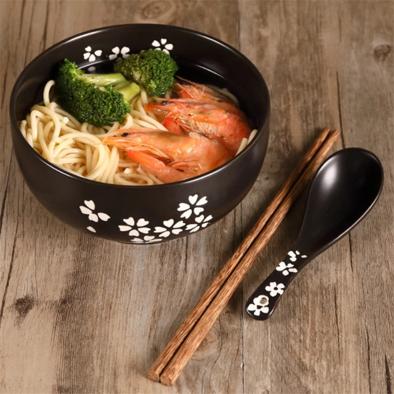 Ce grand bol chinois de couleur noir ornementé de jolies fleurs blanches est livré avec ses accessoires. À savoir : un petit plateau de service, un dessus de plat et quelques couverts asiatiques avec deux baguettes en bois et une grande cuillère en porcelaine fine. Cette pièce de vaisselle en terre cuite mesure 16 cm de diamètre, 8 cm de hauteur et propose une contenance d’environ 75 centilitres.