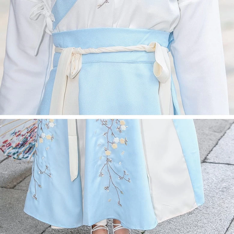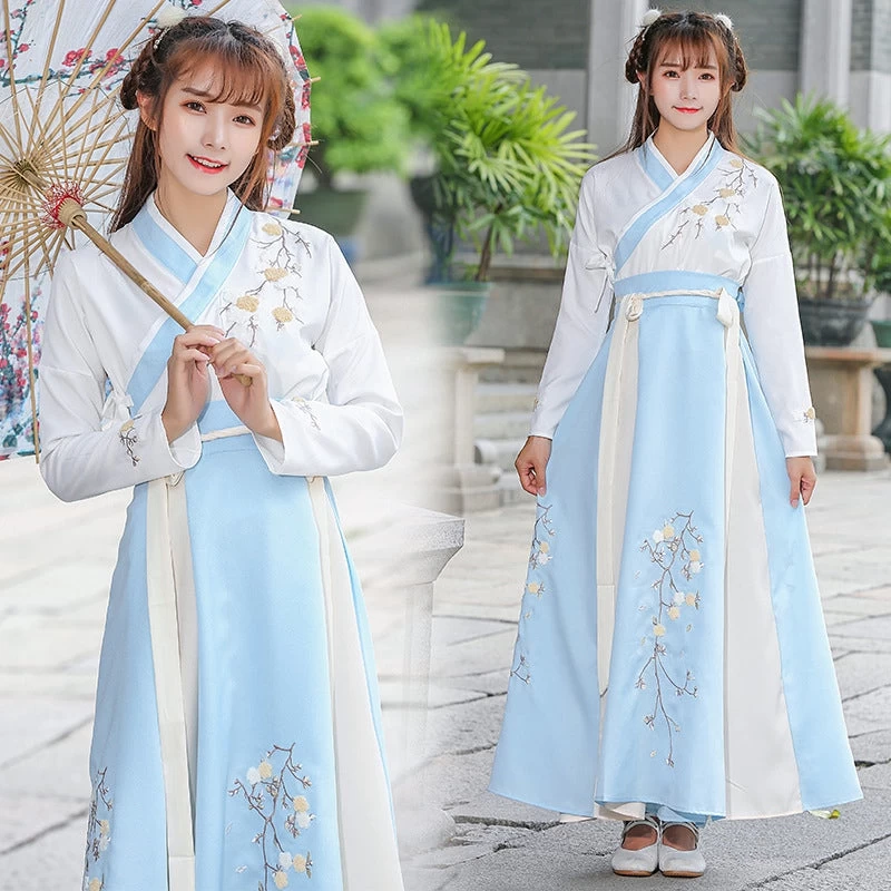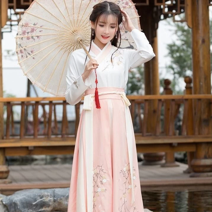 Ce vêtement pour femme chinois est un véritable costume traditionnel. Ici, il est composé de deux pièces : une jupe et son haut, accompagné de la ceinture à nouer allant avec la tenue. Léger, cet hanfu au col croisé a été conçu avec des matières douces comme du coton, de l’acétate et du polyester.