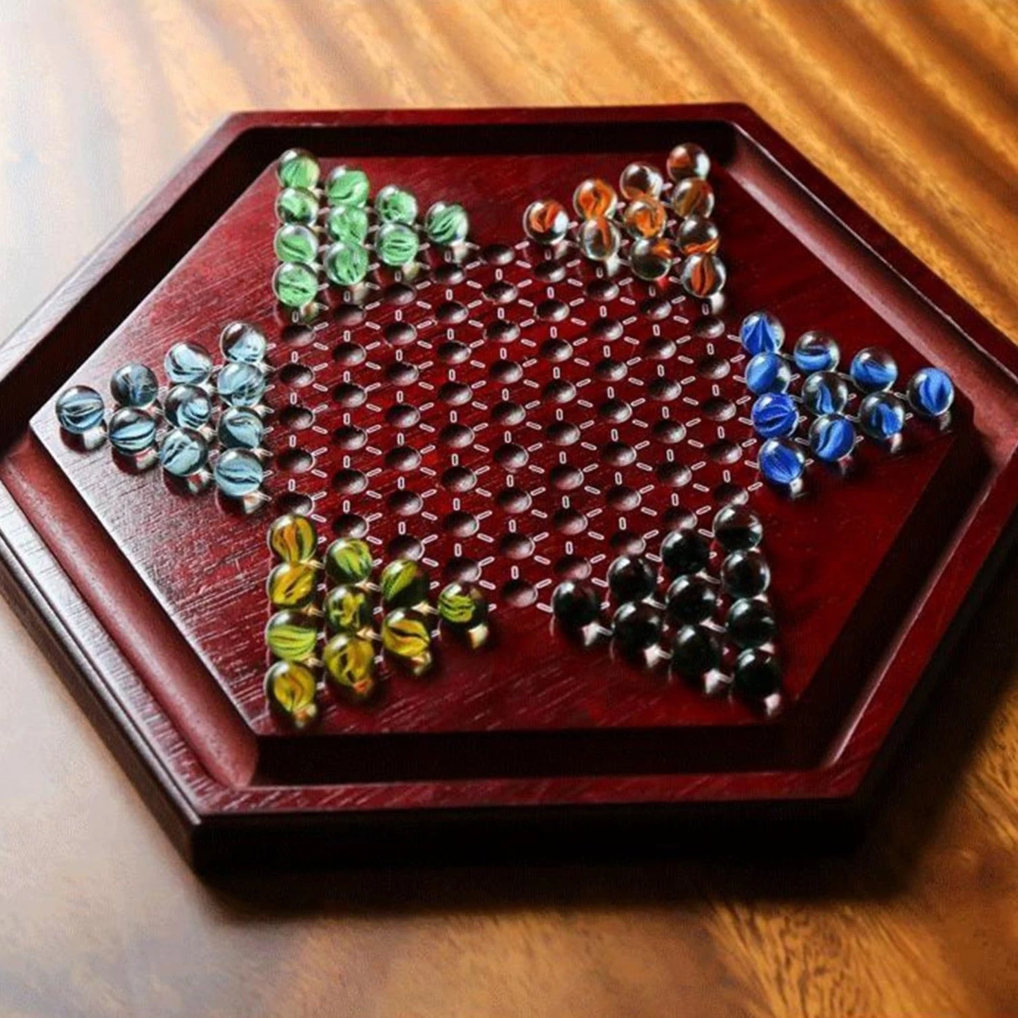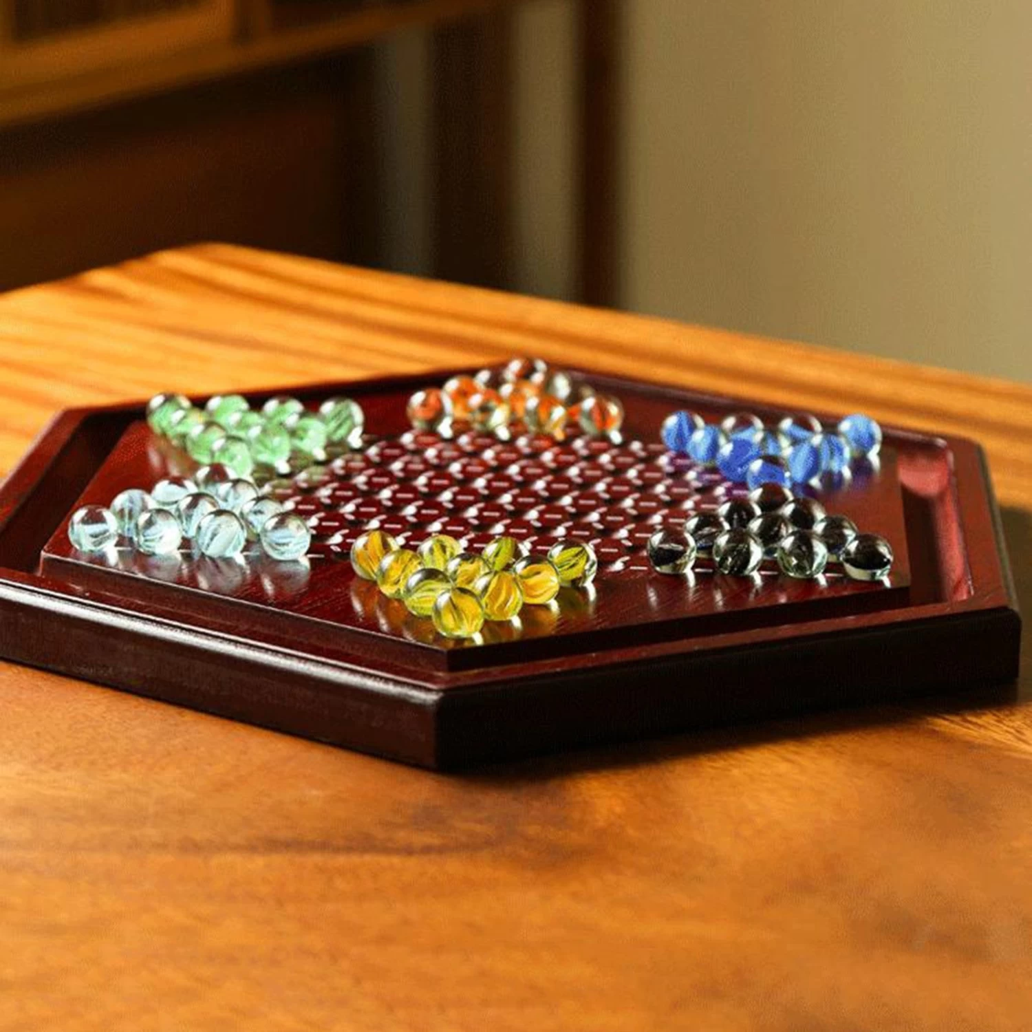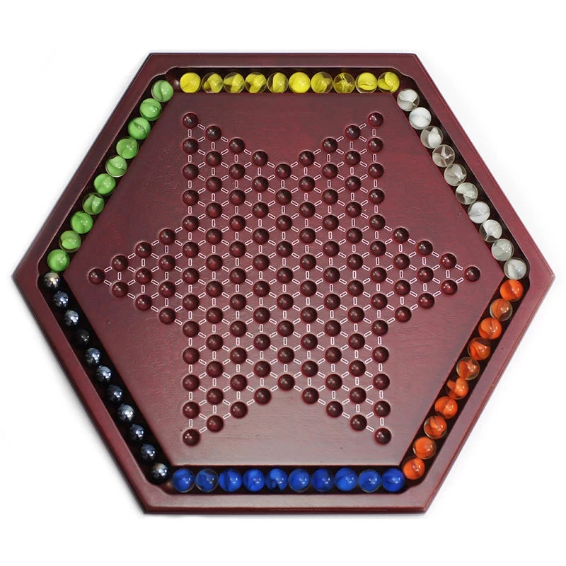 Ce divertissement possède une apparence luxueuse. Il est composé d’un plateau de jeu en santal doté de 121 trous agencé en rangée et formant une étoile. Il comporte aussi un petit caniveau sur son pourtour pour pouvoir stocker les 60 billes en verre fournies avec le jeu de société.