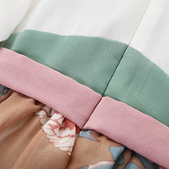 Très évasée, cette robe courte est mise en valeur par un magnifique imprimé fleuri. Sur fond vert ou orange en fonction du modèle, elle est assortie d’un joli ruban de couleur unie. Et avec la sous-jupe en tulle et les manches courtes, ce hanfu traditionnel se porte autant en plein été qu’au printemps ou à l’automne.