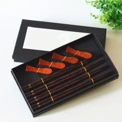 Voilà un joli set de baguettes chinoises fabriqué à la main avec du bois naturel. L’ensemble est exposé dans une petite boite noire refermable idéale pour garder ses ustensiles au propre. Ce set contient quatre paires de baguettes, mais ce n’est pas tout. En effet, il vous propose aussi quatre repose-baguette en bois présentés sous la forme de poissons. Parfait pour y déposer ses couverts le temps de siroter sa boisson pendant le repas par exemple. Avec ce set de baguettes en bois, vous pourrez compléter votre service de table ou même offrir un cadeau totalement innovant à la personne de votre choix.