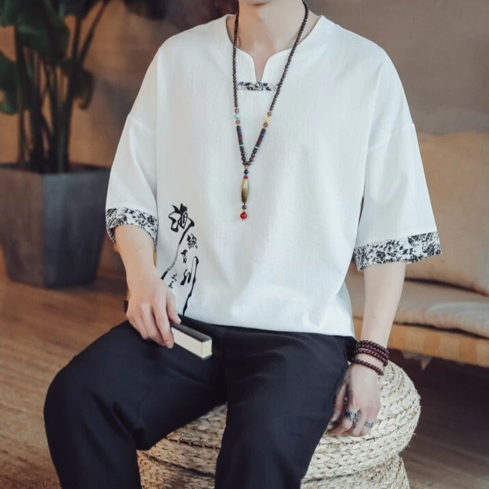 Audacieux, unique, soigné et dynamique seront employés pour qualifier votre look si vous décidez d’opter pour ce t-shirt chinois. Ce dernier est floqué de signes mandarins, une méthode d’impression réalisée à chaud grâce à une presse spécialisée. Aucune fibre synthétique ne façonne le tissage, le maillot vendu sur cette page réunit seulement des matières naturelles peu allergisantes. En observant avec attention, on peut dénoter quelques détails comme un collet arrondi cassé par une fente, des manches patchwork puis une boutonnière ornementale sous le cou. Il fera une idée cadeau au top pour un beau et jeune gaillard.