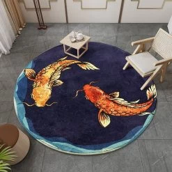 Un contraste parfait, un dĂ©cor somptueux, c’est ce que montre ce tapis chinois rond en laine pour nous charmer. Vous pouvez choisir la carpette dans diffĂ©rents diamĂštres en partant de 60 jusqu’Ă 120 cm. Ce tapis de sol est habillĂ© de deux jolis poissons rouge orangĂ© sur un fond d’une teinte bleu marine. Le dĂ©gradĂ© plus clair et les portions blanches couvrant une partie de la bordure circulaire nous rappellent toujours les cĂŽtes de la mer de Chine et son air si paisible.