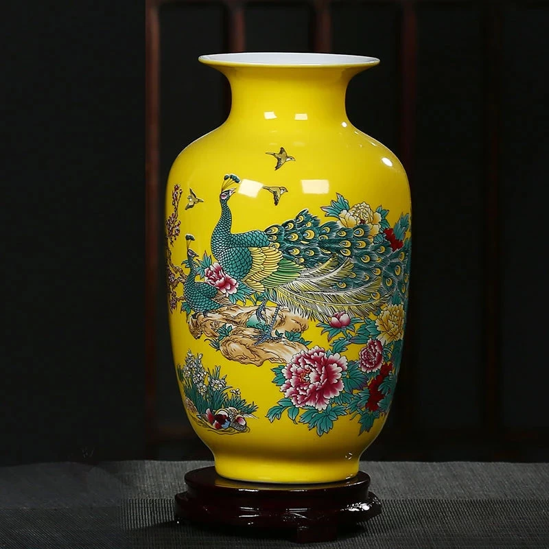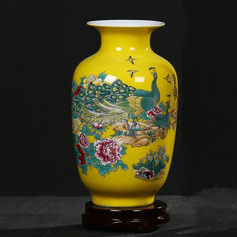 Créez une décoration asiatique qui vous fera vibrer avec ce vase chinois paon. Fabriquée à la main, cette belle poterie en porcelaine fine est composée de teintes vertes, roses et oranges contrastant avec un beau fond jaune soleil.